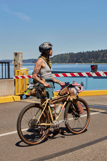 The Hold Fast Frame Bag is our number one solution for smart, inconspicuous storage on your bike. The main compartment is accessed via a drive side water-resistant zipper. A smaller zipper pocket on the non-drive of the bag is perfect for a snack or cell phone. To accommodate a variety of frames, there are webbing daisy chains on the top panel for flexible attachment points and extra long fixed Velcro straps intended to be cut-to-fit to your needs. On the top of the bag we added an exit port for a hydration hose or power cable, and along the underside of the bag there is a webbing daisy chain that runs the length of the bag for additional lash points for items like a pump, tent poles.