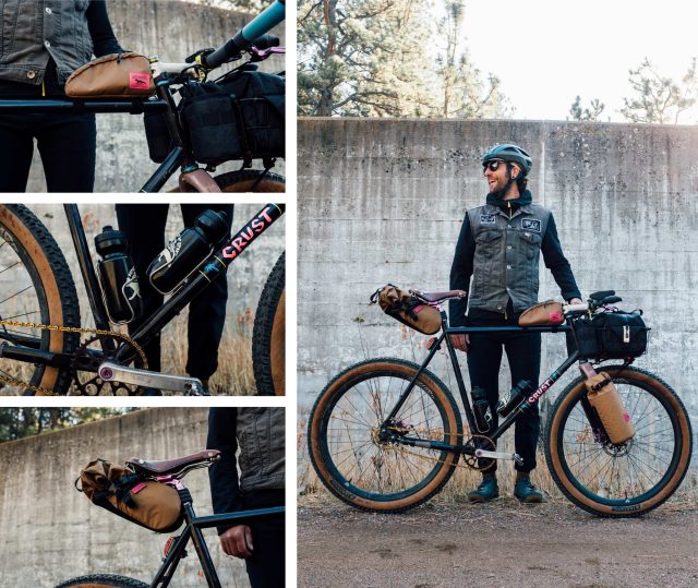 What are your favorite Swift bags for this ride and what are you packing in them at this time of year? I like this rig specifically for commuting the 10mi to our local climbing crag–Eldorado Canyon–so this bike is set-up for capacity and ease of accessibility at the transition to climbing. A Sugarloaf Basket Bag is perched on a Velo Orange Flat Pack Rack, and the fork blades are adorned by the forthcoming Gemini fork bags (coming Spring 2024). I stuff these with either a climbing rack of cams and slings or a climbing rope (these items are split with my climbing partner; I rarely have to carry both rope and rack), climbing harness, chalk bag, shoes, jacket, etc. The Sidekick Stem Bag and Moxie Top Tube Bag house quick-to-access items like wallet, snacks, and gloves and the Olliepack is usually where I carry my approach shoes and an extra layer.