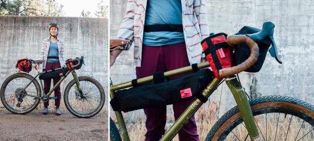 What are your favorite Swift bags for this ride and what are you packing in them at this time of year? In this portrait, my bike is setup for a bike-to-climb mission, a near-weekly routine for my partner, Tony, and myself. There’s an historic trad climbing area just 6 miles from our house that makes for a chill “multi-sport” outing when ride there with the climbing gear. Here, I’m running the Capstone Handlebar Bag (coming Spring 2024) up front paired with two Gibby Stem Bags for climbing shoes, harness, belay device, and water bottles. The Hold Fast Half Frame Bag has my repair items, wallet, bike lock, lights, and packable wind jacket. Seated on the rear Carradice Bagman Support, I’m rocking a Zeitgeist Pack for the rope! Lastly, I’m wearing the Ardea Hip Pack for easy access to phone, camera, chapstick and snacks.
